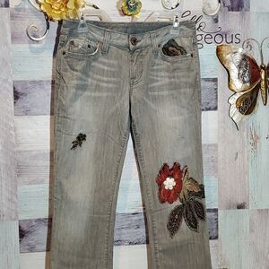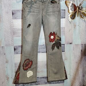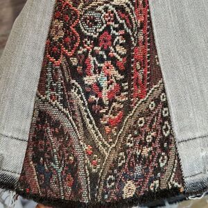 Upcycled by Me. I added vintage tapestry to flares and floral details. One of a kind design!!