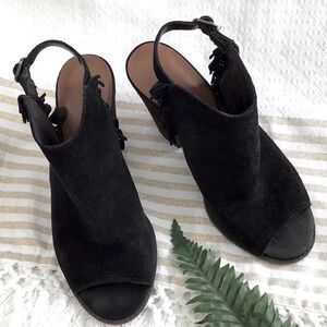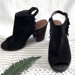 Lucky Brand LANTAU Black Fringe Suede Boho Chic Block Heel Ankle Bootie Sandals