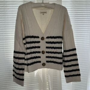 Lucky Brand L-XL White Black Stripe Cable Knit Button Front Wool Blend Cardigan