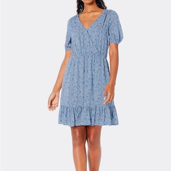 Step out in style in this sweet blue & white polka dot dress with red accent. Featuring a V-neckline, short capped sleeves with ruffled hem. Modal and polyester blend. L 35” x W 20” pit to pit. NWT