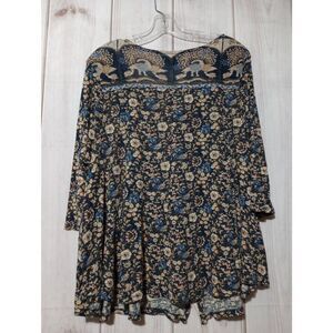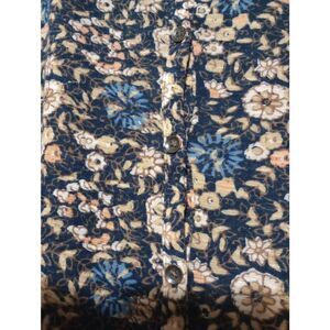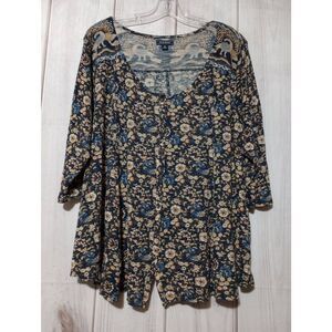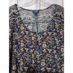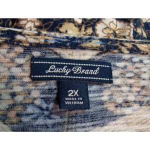 Lucky Brand Shirt Ladies 2x Navy Tan Floral 3/4 Sleeve Scoop Neck Brass Button F