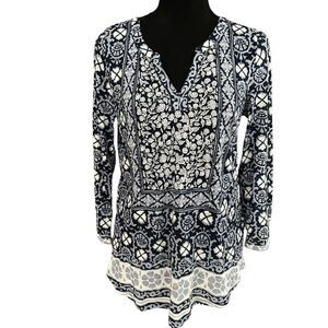 Lucky Brand patterned split neck top, size S. Cotton modal blend. Long sleeves with gold tone buttons, extra button provided. Navy blue background with ivory and light blue. Slightly rounded bottom hem. Approximate measurements are pit to pit flat 18”, length from shoulder approximately 26”.Lightweight.