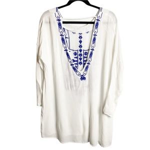 Lucky & Coco - White with Blue Embroidery Longline Tunic Swim Coverup - Sz. L