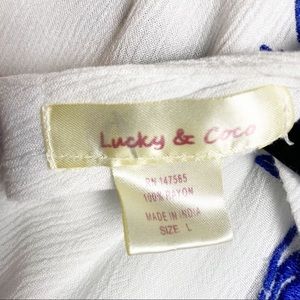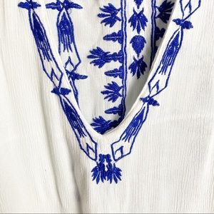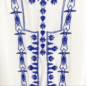 Lucky & Coco 100% rayon, white tunic featuring royal blue embroidery, drop sleeve and deep v-neck back.