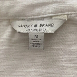 This is a Lucky cream medium shirt. Has buttons going down the front with very pretty design in the front. Pit to pit it is 18 inches.