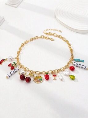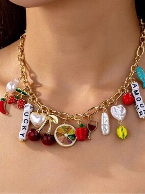Eye-catching gold-tone chain necklace with colorful fruit and novelty charms. Features red cherries, green and yellow fruit accents, and enamel detailing. Adds playful, bold color to any outfit. Lightweight and versatile for everyday wear.