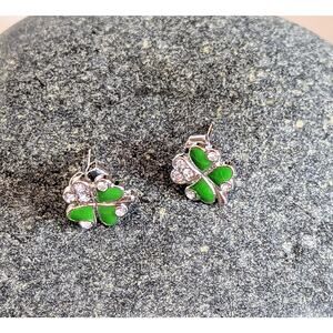 May the luck of the Irish accompany you with these charming green four-leaf clover earrings, adorned with a silver outline and sparkling clear white crystals. Perfect for St. Patrick's Day or for wearing all year long! The earrings measure about 1/2 inch by 3/8 inch, and they come with post backs included.