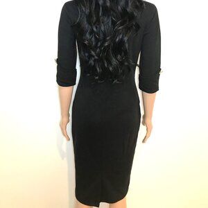 Lucky Lady Women’s dress in elegant black, featuring distinctive golden buttons. Perfect for professional settings and special occasions alike, this dress ensures you'll always look and feel your best. Whether you're at work or at a social event, the Lucky Lady dress combines style and functionality for every occasion. The dress is in excellent used condition and conveniently machine washable for easy care.