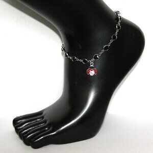 This listing is for an eye catching Lucky Ladybug anklet/ankle bracelet. The black crystal glass anklet is 8.5 inches long with a 1.5 inch extension chain and a lobster clasp. It has an adorable enamel and silver plated ladybug charm with a sparkling white CZ crystal between its wings!
