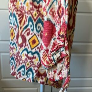 Keywords: ikat print, bohemian blouse, long sleeve top, tunic top, colorful blouse, boho chic, festival top, casual blouse, womens top, patterned blouse, red blouse, yellow blouse, teal blouse, cream blouse