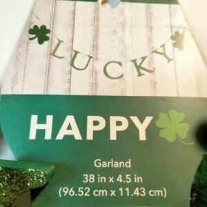 Festive garland featuring glittery green "Lucky" letters and shamrocks. Measures 38 inches long, perfect for St. Patrick's celebrations.