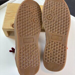 New, never worn Lucky Step sneakers in a rich burgundy suede-look finish with white stripe detailing and gum soles. Comfortable air-cooled footbed and lightweight platform give them that vintage sporty look with all-day wearability.