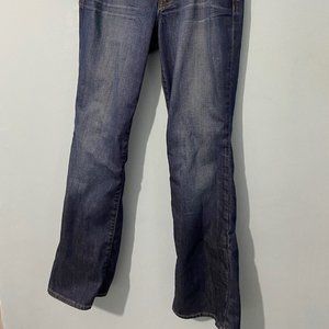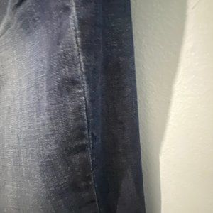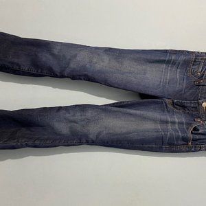 Soft denim. Relaxed fit (wider legs). Factory fade/wrinkles. Slight wear on seams from washing. Good/excellent used condition.