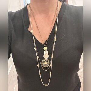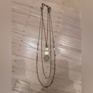 Antiqued gold. Lots of optionality - wear with 1, 2, or 3 of the strands.