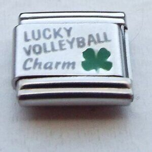 New never worn 9mm stainless steel Italian charm bracelet link with Lucky Volleyball charm lasered with a green enamel clover on it.Fits all standard 9mm Italian charm bracelets.Thanks for looking!