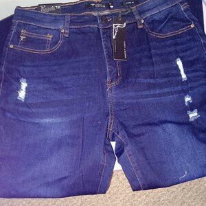 Hig Rise, extreme flare, distressed and frayed hem, Tall jeans Size 18 darker blue, brand new with tags, boutique jeans