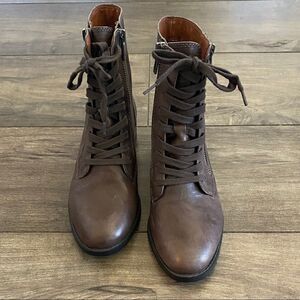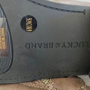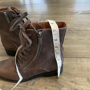 Brand new Lucky ankle boots in aged leather. Zippers on each side of laces. Color is pewter-neutral brownish/grey. Size 6M