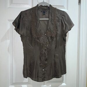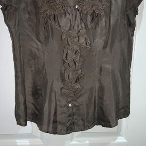 Lucky brand button front lace trim silk blouse Sz M square collar flutter sleeve