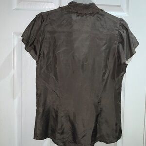From the previous listing-- Lucky brand button front silk blouse | Sz M | Lace trim | Square collar | flutter sleeves | Spare button | Very good used condition | Flat lay approx | Armpit 20” | Center back 24”