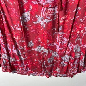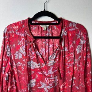 Add some bohemian flair to your wardrobe with this beautiful Lucky Brand blouse. Featuring a vibrant red color and a floral print, this blouse is perfect for any occasion. The long sleeves and V-neckline add a touch of elegance, while the fringe trim gives it a fun and playful feel. Made from lightweight and breathable viscose material, this blouse is perfect for all seasons. It's easy to care for, as it's machine washable. Whether you're dressing up for a party or keeping it casual for a day out, this blouse is sure to make a statement.