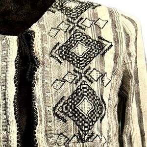 This cardigan is embroidered and has a single tie at the top on the front otherwise it is open. It has 3/4 sleeves and is very soft.