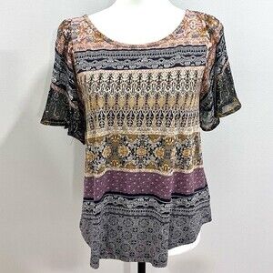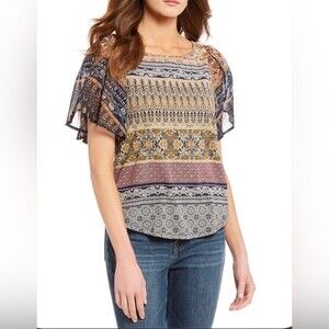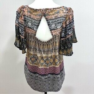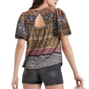 Lucky brand mixed media boho print keyhole back top size medium