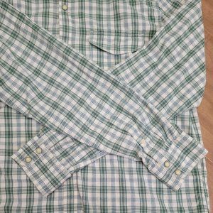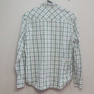 Men's Lucky Brand two pocket western snap button down shirt size L. Item comes from a smoke free and pet free home. The button for the right front pocket came off and I will send with shirt. There is also a bit of wear just below that same pocket.