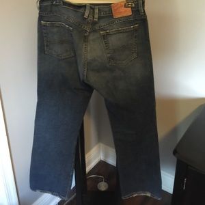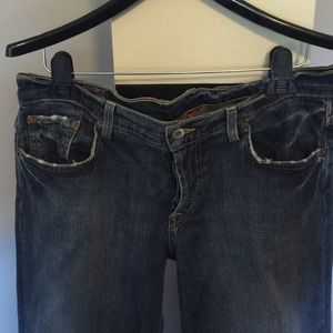 Button fly jeans from Lucky! Pockets and bottom of pants distressed.