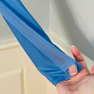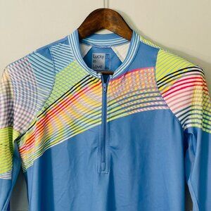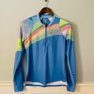 The perfect warmup for the athlete who really wants to bring some heat to the court or course. This 1/4 zip long sleeve has underarm mesh inserts for maximum breathability, thumbholes for added coverage and UPF 50+ rating sun protection. All done in our performance jersey fabric with moisture-wicking that keeps you dry and cool. Perfect for sporting, tennis, pickleball, golf etc. Slightly Curved hem with side slits. Light blue with multi color stripes and swirls. Shirt Only.