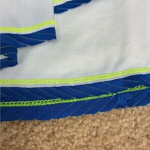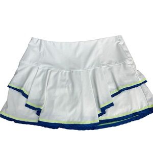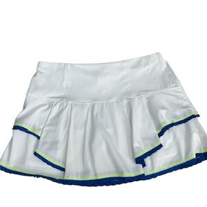 This mini skirt/skort from Lucky in Love features a tiered layers.The crisp white fabric is beautifully accented with blue and yellow trim, making it perfect for athletic or resort wear. Designed for movement, it combines a sporty aesthetic with a feminine touch.