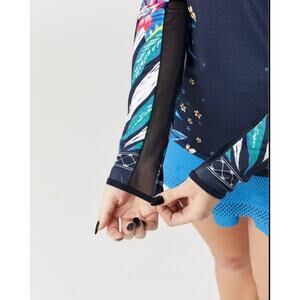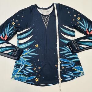 Lucky in Love Womens Large Long Sleeve Rash Guard Top Blue Floral Mesh Trim