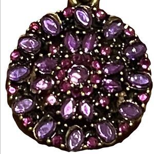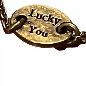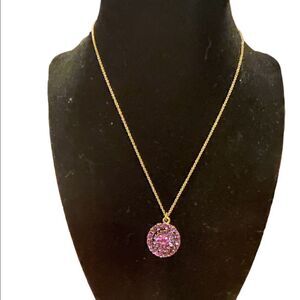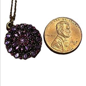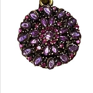 Lucky you chain necklace with round encrusted pendant with purple rhinestones. Very dainty. Brass tone hardware.