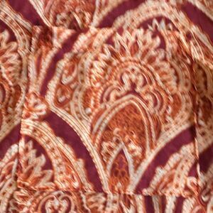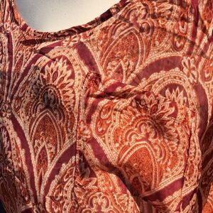 Is an extremely lightweight silk T shirt styled silk top. The colors are maroon and rust and tan. Peach colored blouse