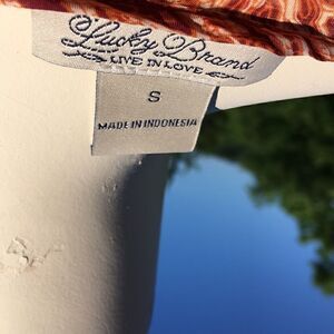 Lucky Brand silk top with a warm, earthy color palette. The shirt features a pattern reminiscent of stylized floral or feather motifs in shades of orange and brown