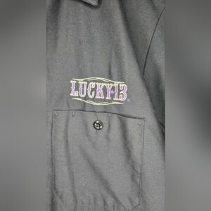Rev up your style with this bold and edgy Lucky-13 button down shirt, featuring a striking custom hot rod car graphic on the back and classic work shirt details on the front. Made from a durable cotton/poly blend, this shirt combines retro SoCal flair with everyday comfort. Perfect for fans of vintage cars, rockabilly fashion, or standout streetwear. Size Medium, fits true to size. NEW WITHOUT TAGS.