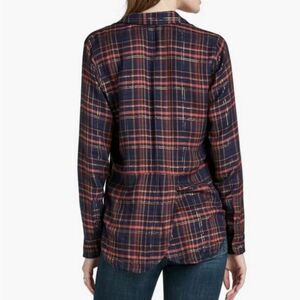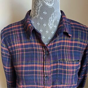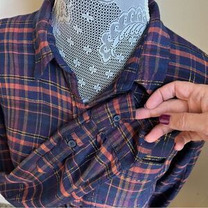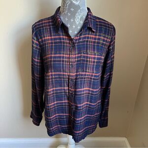 Lucky brand light weight plaid button down. Navy blue orange with copper plaid. Front pocket. Back has slit to be worn lucked.