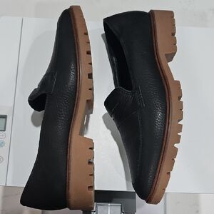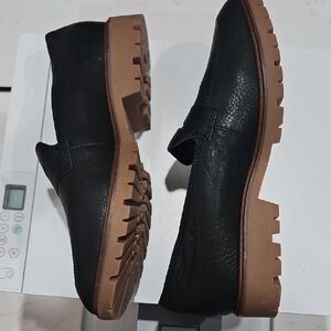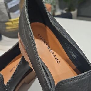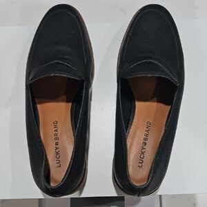 Classic Lucky Brand LK Tomber black leather loafers with a sturdy brown sole. Perfect for everyday wear. Comfortable and stylish.