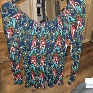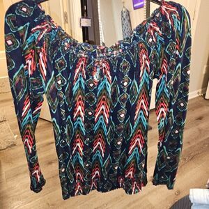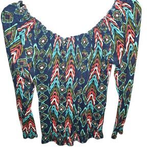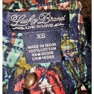 This vibrant blouse from Lucky Brand showcases a dynamic blue and pink pattern, enhanced by smocked and ruffled details. The flowing design and wide neckline offer a casual yet stylish look, perfect for any occasion.