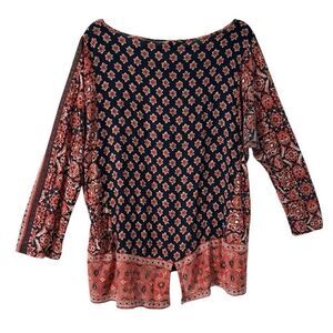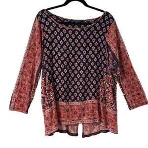 Lucky Brand L boho print wide boat neck soft rayon knit back vent top