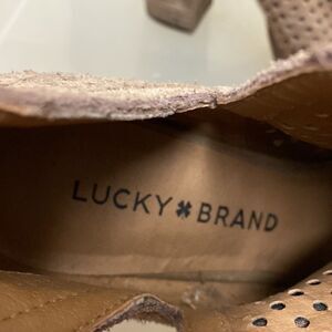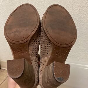 Tan suede peep toe ankle boots from Lucky Brand. Laser cut detail. Split topline. Stacked heel. Size 6.
