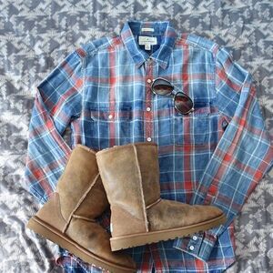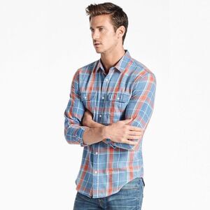 Washed cotton twill elevates the vintage appearance of a versatile, workwear-style plaid shirt detailed with a pair of button-flap patch pockets at the chest. Brand new without tags. Size small.