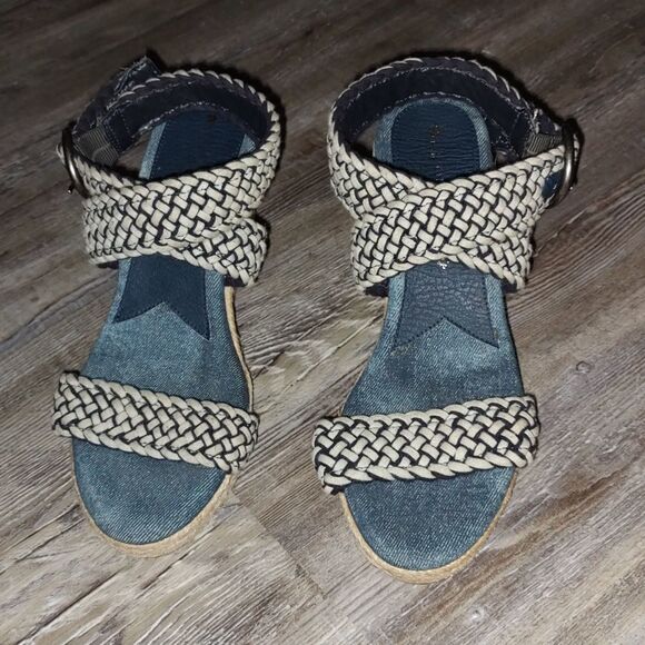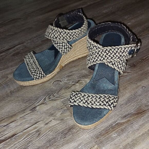These nautical-style wedges are comfortable and cute! Braided straps wrap around your ankle. Only worn once!