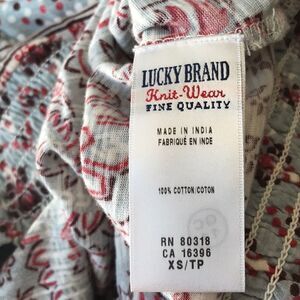 Lucky Brand boho style top in small gray/ivory/red/brown print. Wide elasticized neckline and hem. Narrow elasticized sleeve cuffs. Center front neckline slit with button loop closure. Stretch knit of 100% cotton. Size XS. New, no tags. Nonsmoking home.