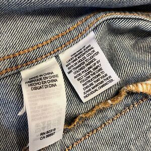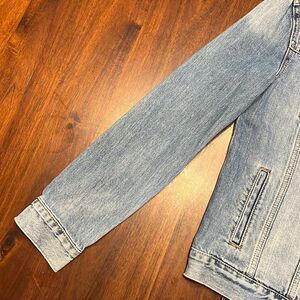 Excellent condition 100% cotton denim jean jacket in “boyfriend” style. Four outer pockets, two inner. Light factory distressing. Very broken in feel but no signs of wear. Women’s size XS but measurements taken flat are approximately 19.25” across chest, 22.25” long, 18.25” long sleeves from armpit to sleeve hem.
