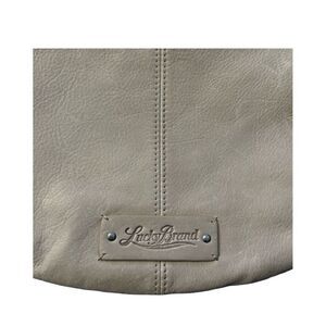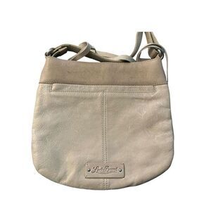 Leather crossbody, front accent studds, slight hassle, back slip pocket for a phone, adjustable straps, top zip closure, and signature logo