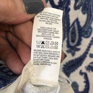Features: Blue and turquoise paisley print on grey/white background on a great lightweight sweater. This sweater, in LIKE NEW CONDITION, has some great texture in the knitted design and a chiffon like hem peaking out from the bottom edge of the sweater. Lightweight sweater perfect for spring.