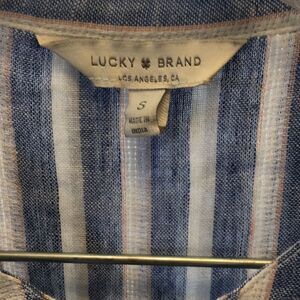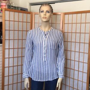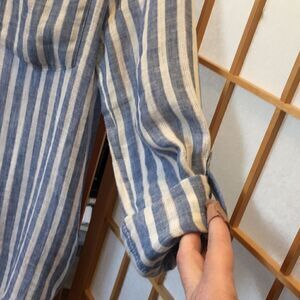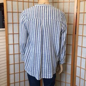 Excellent condition. still has extra button attached to care tag. five buttons down the center. it’s a pull over where you can roll the sleeves up or wear the sleeves down. one pocket on the front. Blue and off white with 1 slightly darker stitch on stripes.