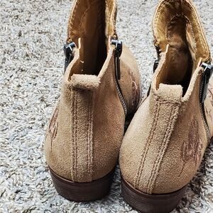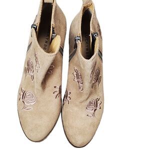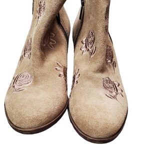 (T) Lucky Brand Tan Suede Floral Ankle Booties, side zippers on both sides, Size 6.5