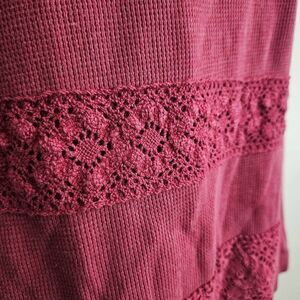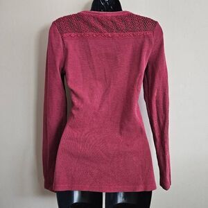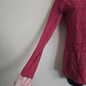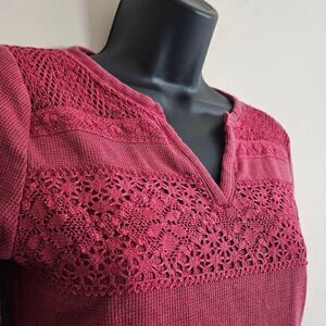 This is a long sleeved red shirt by Lucky Brand. It is waffle knit style with lace detailing.