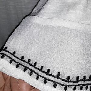 Off white with embroider black boho style design. Sleeves have a little flair. Very cute! Would look awsome with some jeans or shorts.